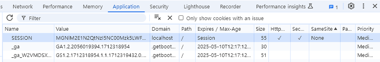 - 쿠키를 확인해보면 JSESSIONID가 아니라 SESSION이란 이름으로 생성