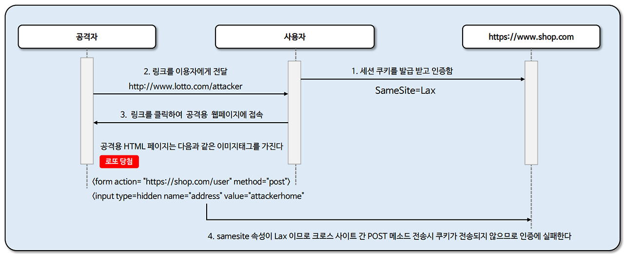 - SameSite는 최신 방식의 CSRF 공격 방어 방법 중 하나로서 서버가 쿠키를 설정할 때 SameSite 속성을 지정하여 크로스 사이트 간 쿠키 전송에 대한 제어를 핸들링 가능