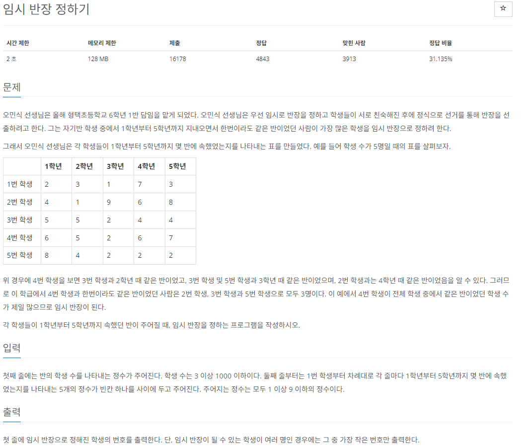 - 같은 반이 가장 많았던 학생이 임시 반장 → 수가 같으면 가장 작은 번호