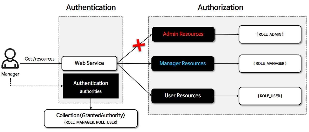 → 스프링 시큐리티는 인가 결정을 내릴 때 AuthorizatioinManager를 사용하여 Authentication(인증 주체)으로부터 GrantedAuthority 객체를 읽어들여 처리