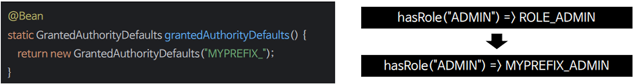 - GrantedAuthorityDefaults를 빈으로 생성하여 hasRole() 사용 시 앞에 붙는 접두사 변경 가능