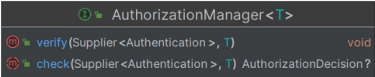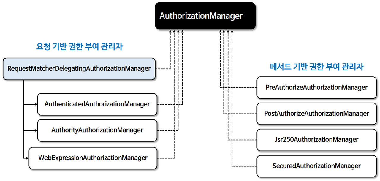 - AuthorizationManager는 Spring Security의 요청 기반, 메소드 기반의 인가 구성 요소에서 호출되며 최종 액세스 제어 결정을 수행