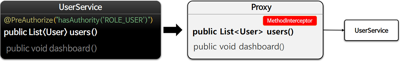 - 보안이 설정된 메소드가 있다면 스프링은 그 빈의 프록시 객체(실제 객체가 아님)를 자동으로 생성