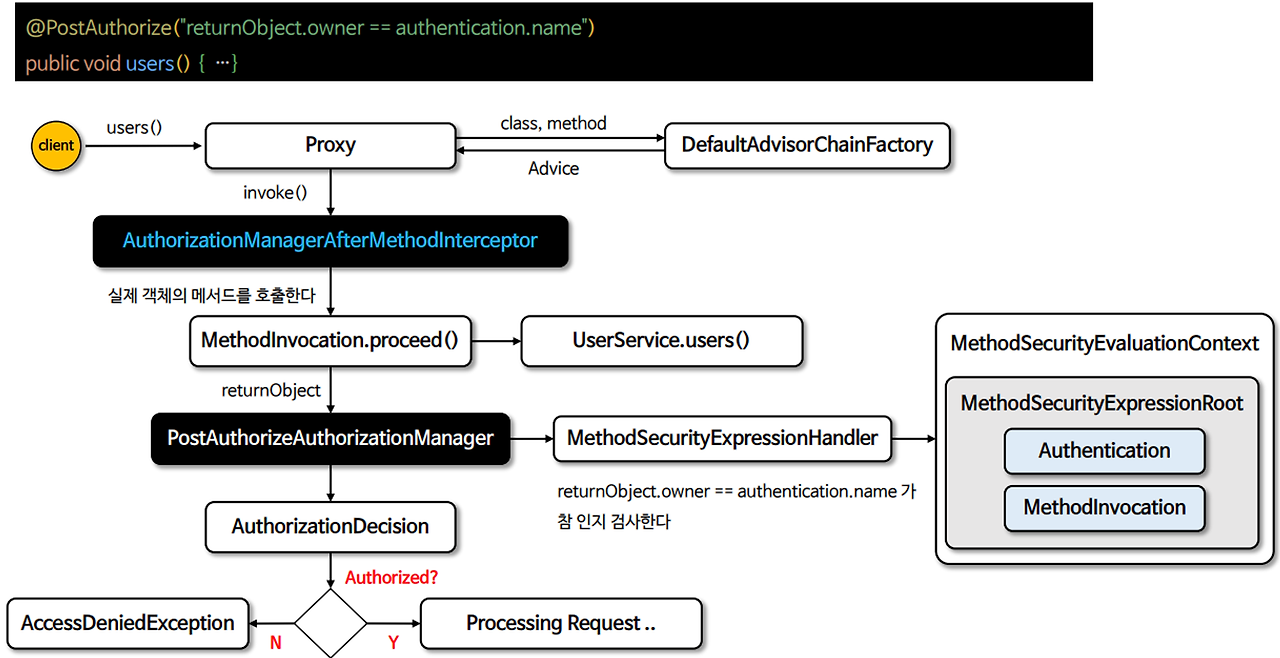 - returnObject(UserService.user()의 반환 객체)를 PostAuthorizeAuthorizationManager에게 전달하여 권한 설정에 대한 평가를 담당하는 클래스 호출 (MethodSecurityExpressionHandler)