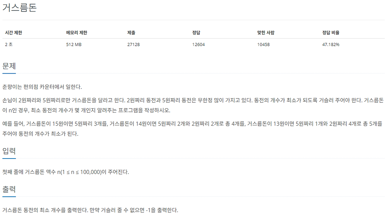 - % 5의 나머지가 짝수일 때는 5원으로 거슬러 줄 수 있는 최대로 거슬러주고