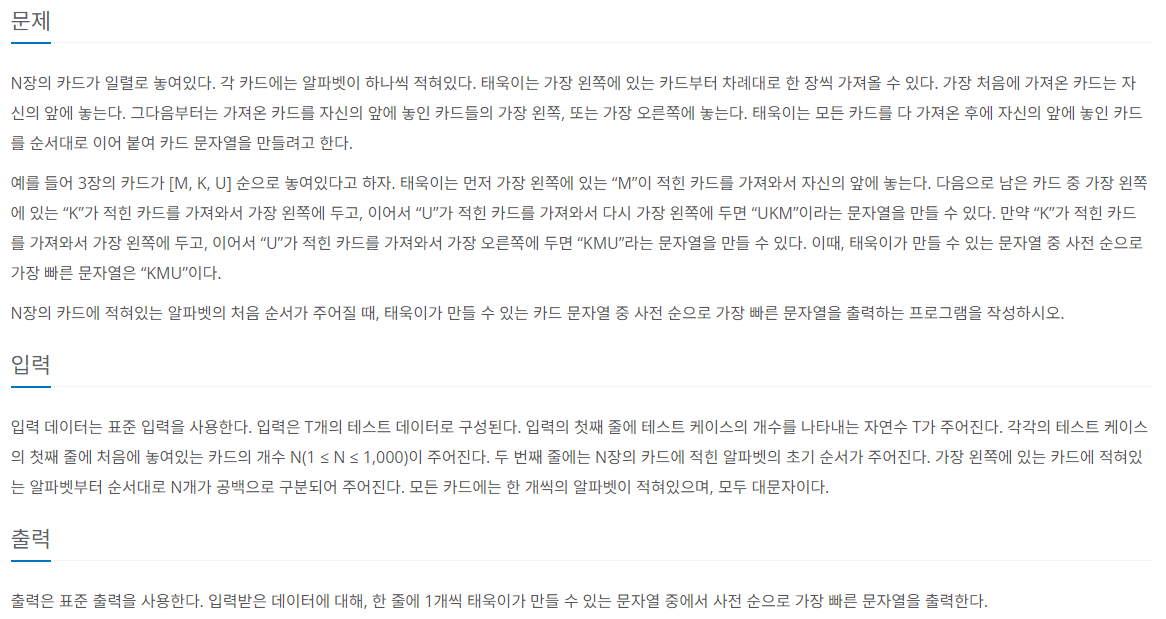 - 가장 처음의 카드를 가지고 온 뒤 이후 카드는 왼쪽 또는 오른쪽으로 배치 가능