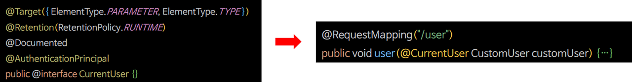 - @AuthenticationPrincipal을 자체 주석으로 메타 주석화하여Spring Security에 대한 종속성을 제거 가능