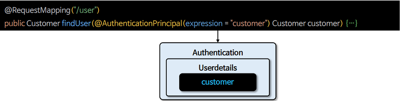 - @AuthenticationPrincipal 어노테이션이 메소드 호출 전 Authentication으로 부터 customer 객체를 principal에서 꺼내서 customUser의 인자로 전달해주는 역할