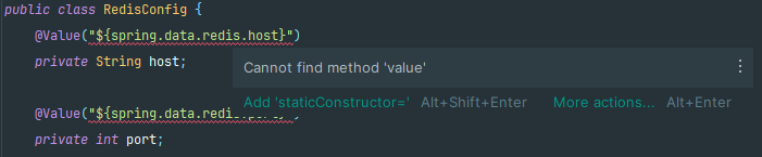 - 하지만, 실수로 lombok의 @Value 어노테이션을 import하게 되면 아래와 같은 문구가 발생하므로 주의