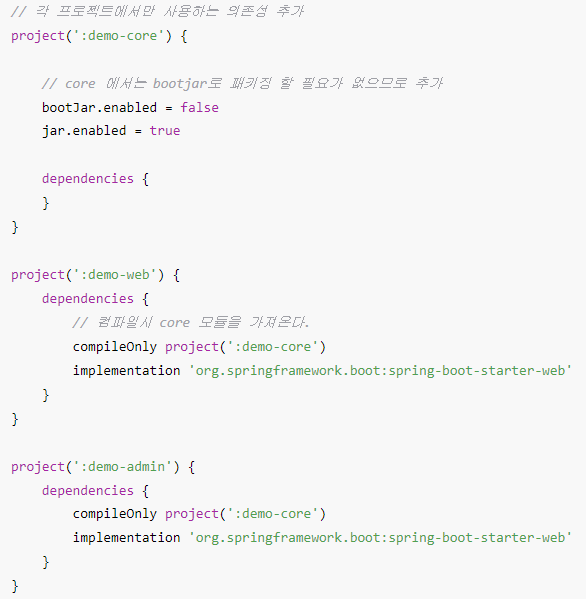 - 이것을 깨닫고 나서 다시 보니, 루트 프로젝트의 build.gradle에서 하위 모듈에 적용시키려면 아래의 코드처럼 작성할 경우 일일히 하위 모듈 build.gradle을 찾아가지 않고, 루트 프로젝트에서 한 번에 컨트롤을 할 수 있다는 의미로 다시 보임