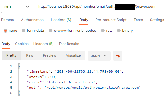- Postman을 이용하여 이메일 인증 코드 발송 → 에러 발생