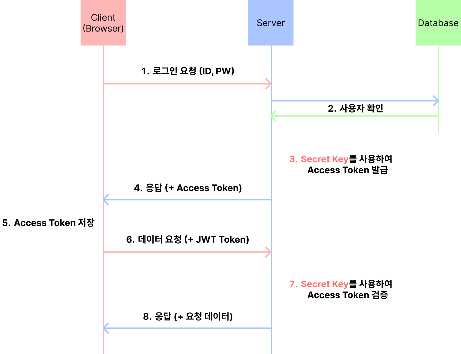 - 로그인 성공 시 서버는 로그인 정보를 Payload에 담고, Secret Key를 사용해서 Access Token(JWT)을 발급