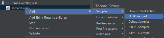 - Thread Group → 마우스 우 클릭 → Add → Sampler → HTTP Request