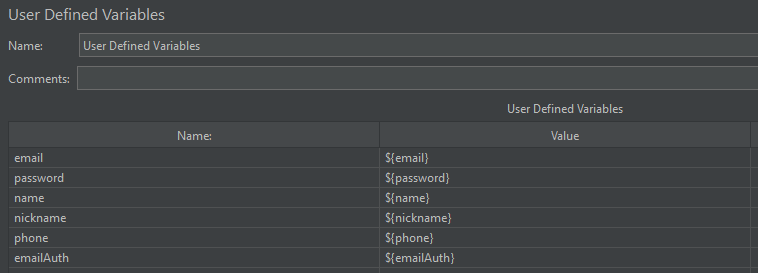 - 준비한 유저 정보를 이용하기 위해 우선 Test Plan에 User Defined Variables를 추가하고 변수로 선언