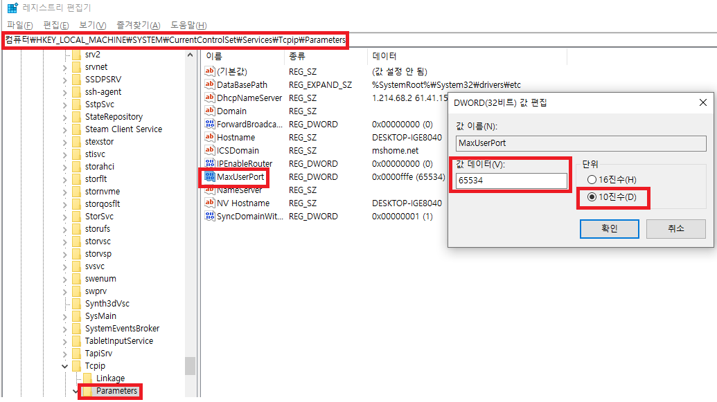 - MaxUserPort 우클릭 → 수정 → 단위 10진수 → 값 데이터 65534 입력 후 확인