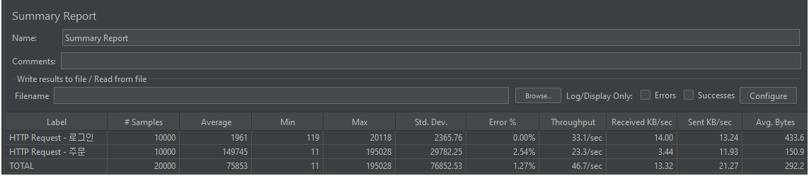 - 위의 방법들로 JMeter에서 에러율을 대폭 감소시킬 수 있었으나, 여전히 2~3%정도 에러가 발생