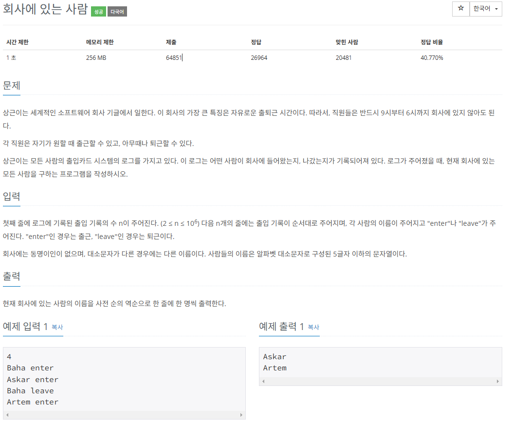 - n개의 줄 : 사람이름 출입기록(enter, leave)