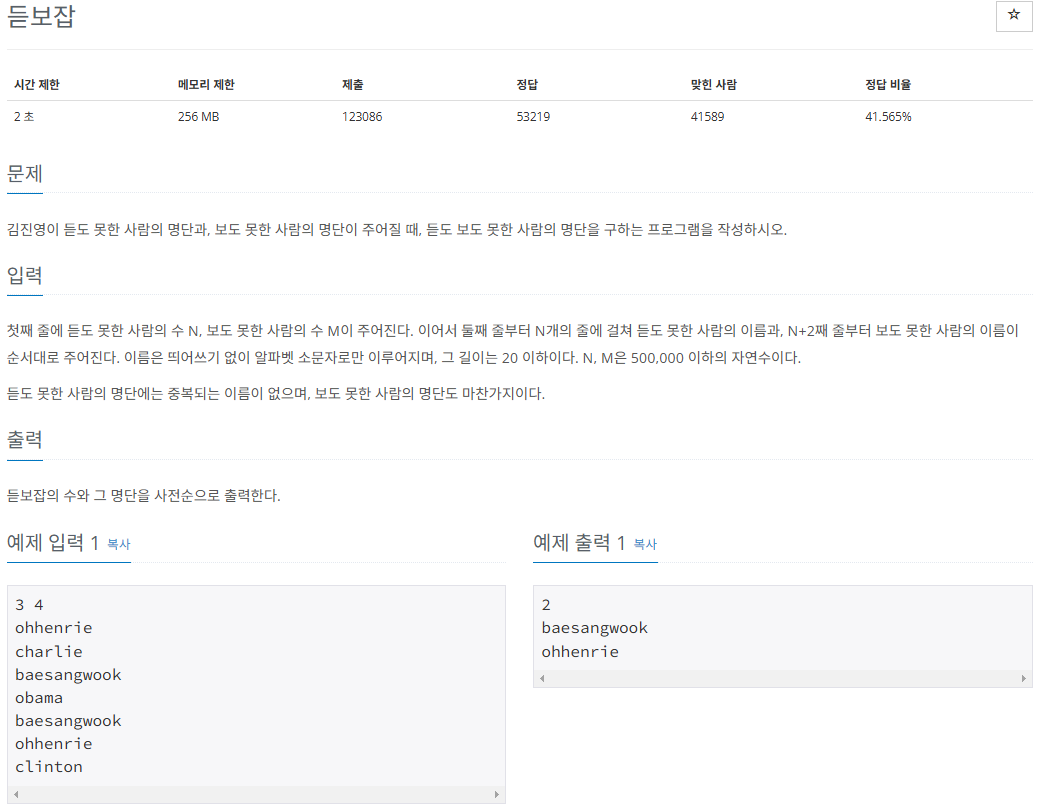 - 첫째 줄 : 듣도 못한 사람 수 N, 보도 못한 사람 수 M (1<= N, M <= 500,000)