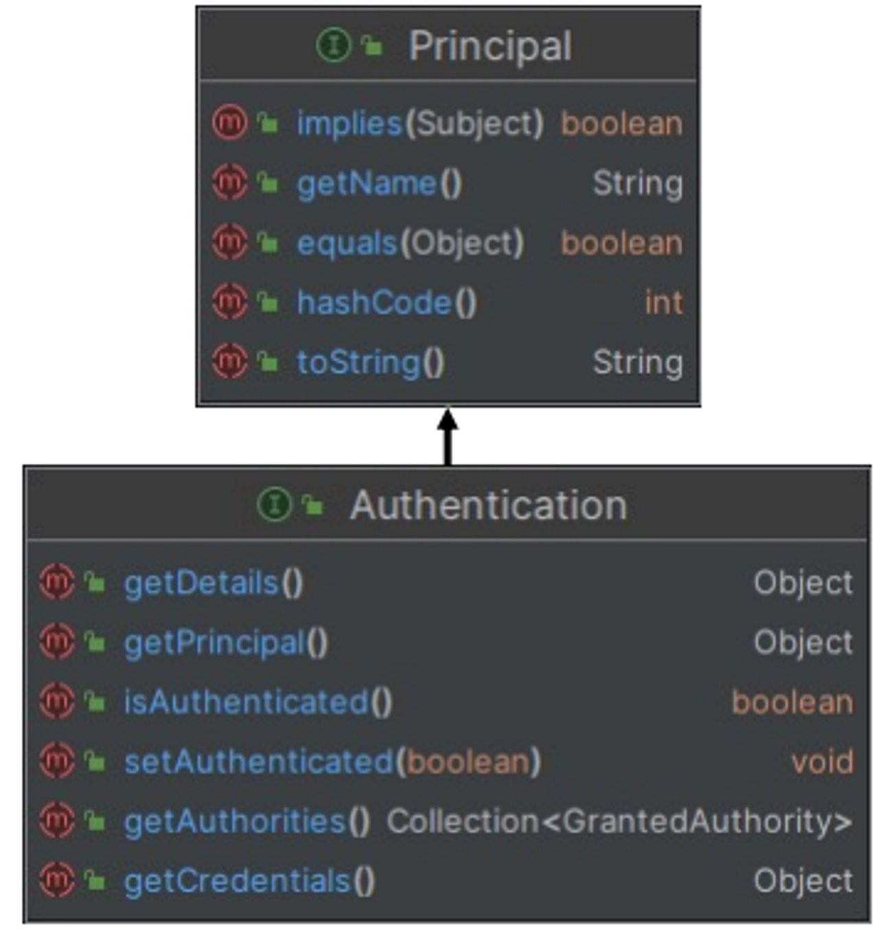 - getAuthorities() : 인증 주체(principal)에게 부여된 권한을 나타냄