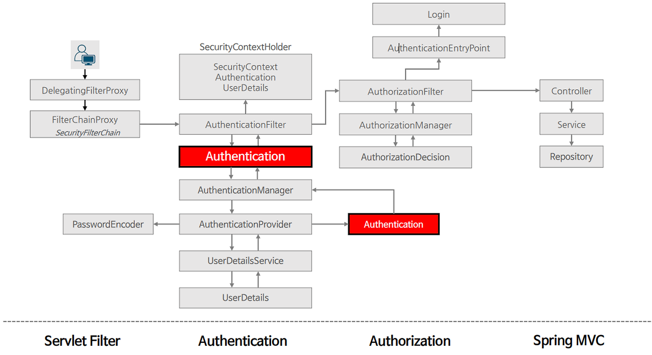 - 최종적으로 AuthenticationFilter는 SecurityContextHolder에 Authentication 객체를 저장