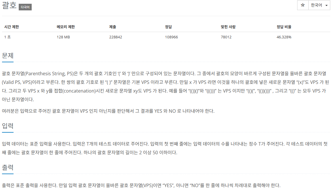 - ~ T번째 줄 : 괄호 문자열 (2 <= 길이 <= 50)