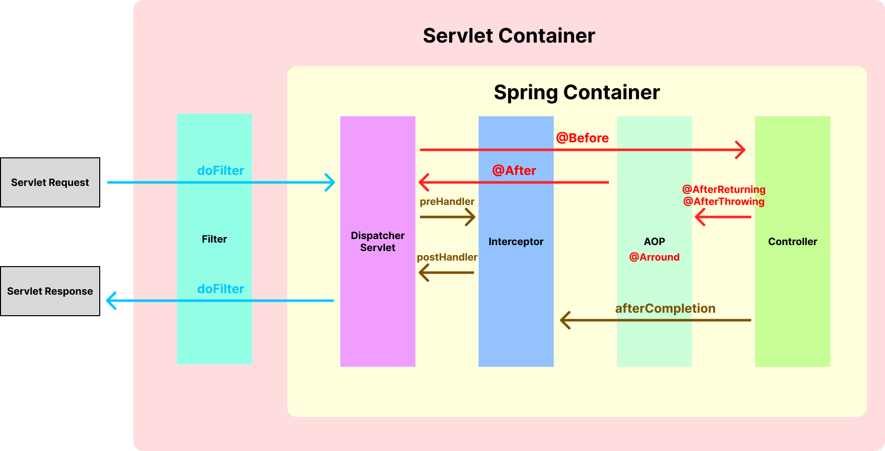 - Interceptor, AOP : Spring Container 영역 = 스프링 레벨