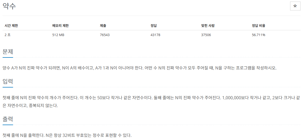- 둘째 줄 : N의 진짜 약수들이 공백으로 주어짐 ( 2 <= 진짜 약수 <= 1,000,000)