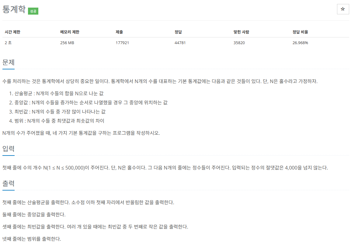 - 셋째 줄 : 최빈값 출력 (여러 개 있을 경우 두 번째로 작은 값)
