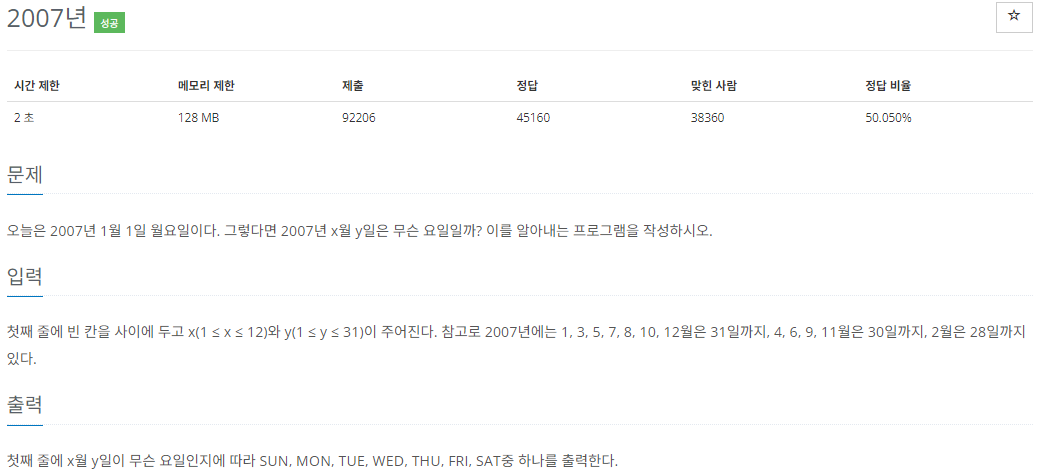 - 입력받은 x(월)를 일자로 환산 + y(일) % 7(일주일) = index ⇒ week[index] 출력