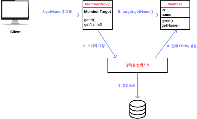 - 최초 로드 시 '실제 엔티티를 가져오는 것'이 아닌 '엔티티의 프록시(MemberProxy)'를 먼저 로드