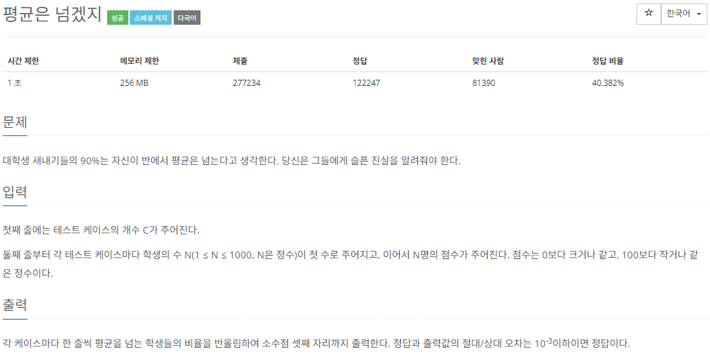 static double[] avgPercent; // 테스트 케이스별 평균 초과 학생 백분율 계산