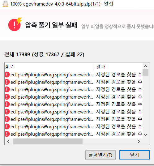 전자 정부 프레임워크 압축 파일을 다운 받아 해제 하려고 하면 해제할 때마다 다르지만 다음과 같이 에러가 발생 함