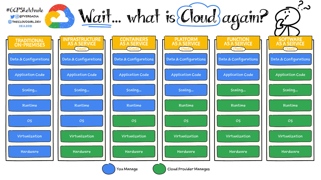 - 다음의 그림에서 파란색은 사용자가 관리해야할 부분, 초록색은 클라우드 제공자가 관리해야할 부분