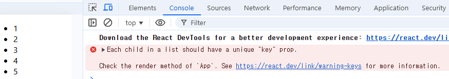 - 아래의 코드에서 1, 2, 3, 4, 5의 li 컴포넌트가 화면에 정상적으로 보이는 듯 하지만 개발자 도구(F12)의 콘솔에는 에러가 발생