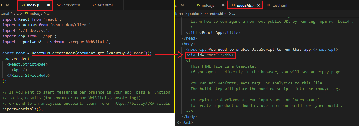 - index.js : 애플리케이션의 진입점(Entry Point) 파일로, ReactDOM을 통해 index.html의 <div id="root">에 컴포넌트를 렌더링
