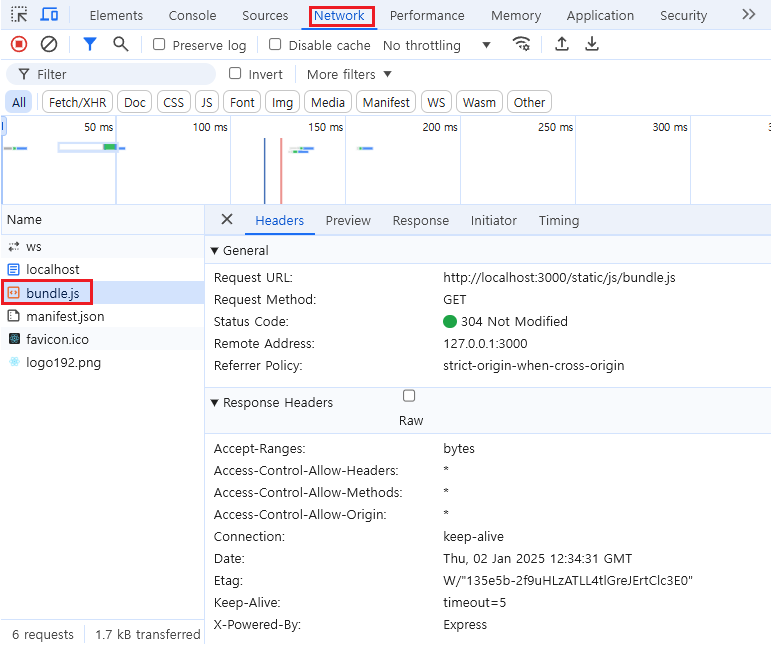 - 브라우저 개발자 도구(F12)에서 Network 탭을 열고 페이지를 새로 고치면, 실제로 bundle.js가 로드되는 것을 확인 가능