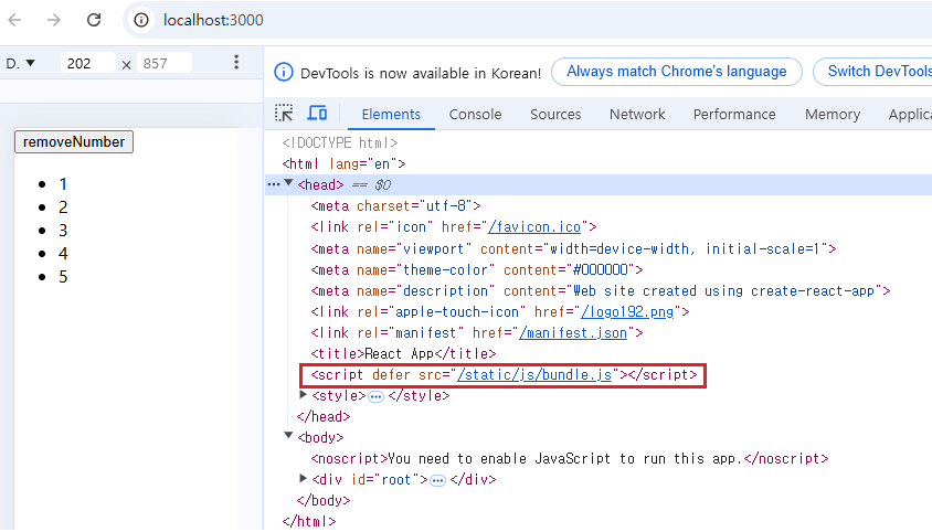 - <script defer src="/static/js/bundle.js"> 태그가 index.html에 자동으로 추가