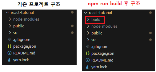 - 프로젝트에서 npm run build 명령을 실행하면, build 폴더가 생성 됨