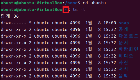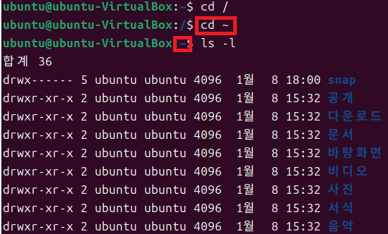 - 현재 로그인한 계정이 ubuntu1이라면 cd ~를 입력하였을 때 ubuntu1의 홈 디렉토리로 이동