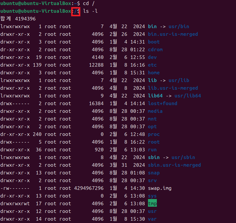 루트 디렉토리(/)에서 하위 디렉토리 출력