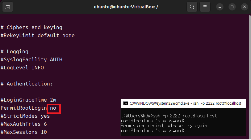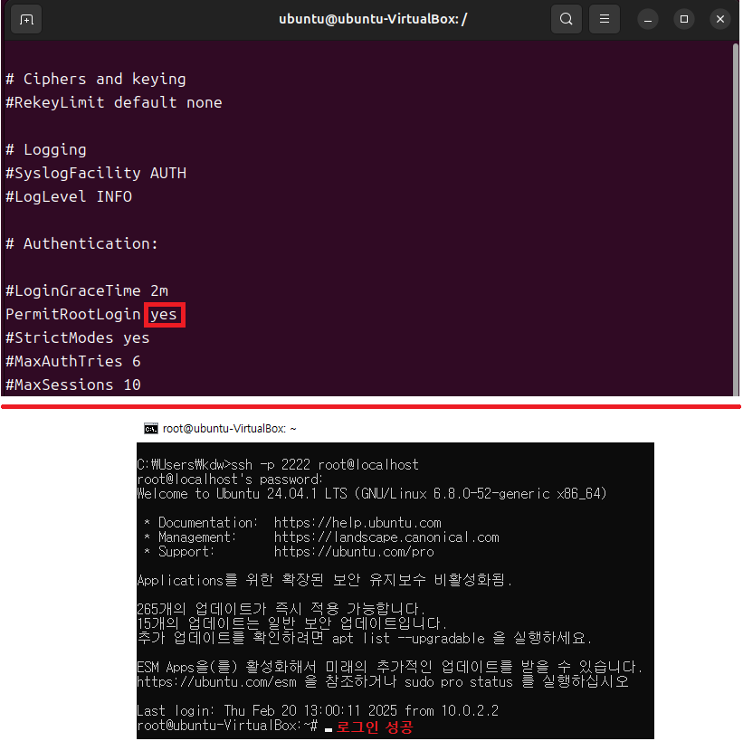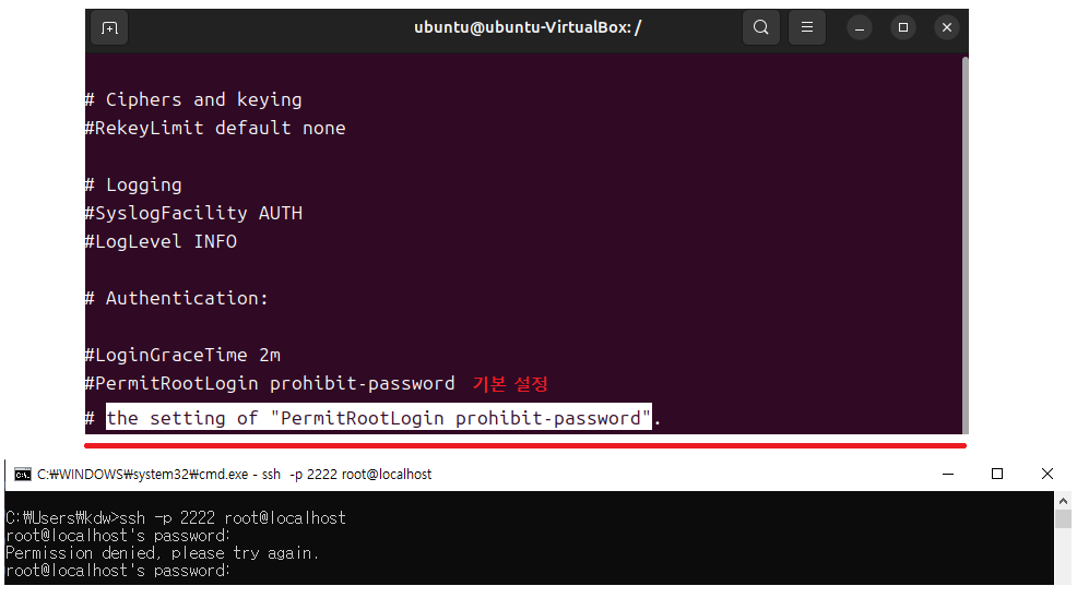 - 'PermitRootLogin prohibit-password'는 root 계정으로 비밀번호를 이용한 SSH 접속은 불가능하지만, 공개 키 인증(SSH key authentication)으로는 접속 가능하게 설정