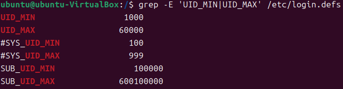 grep -E 'UID_MIN|UID_MAX' /etc/login.defs