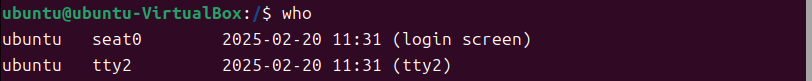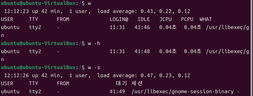 모든 사용자 정보 자세히 출력 (터미널 종류, 로그인 시각 등 기본적으로 출력)