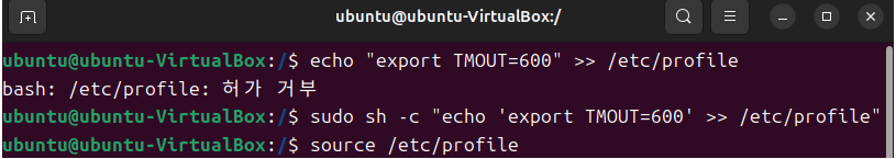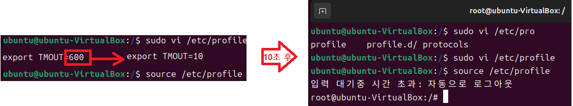 # export TMOUT=600은 쉘에서 사용자가 아무런 명령을 입력하지 않으면 10분 후에 자동 로그아웃하도록 설정