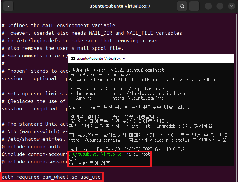 - 'ssh -p 포트번호 root@아이피'로 root에 접근하는 것을 막는 것이고, 일반 사용자로 로그인하여 'su root'로 변경하는 것은 막는 것이 아님 → PAM 설정에서 가능