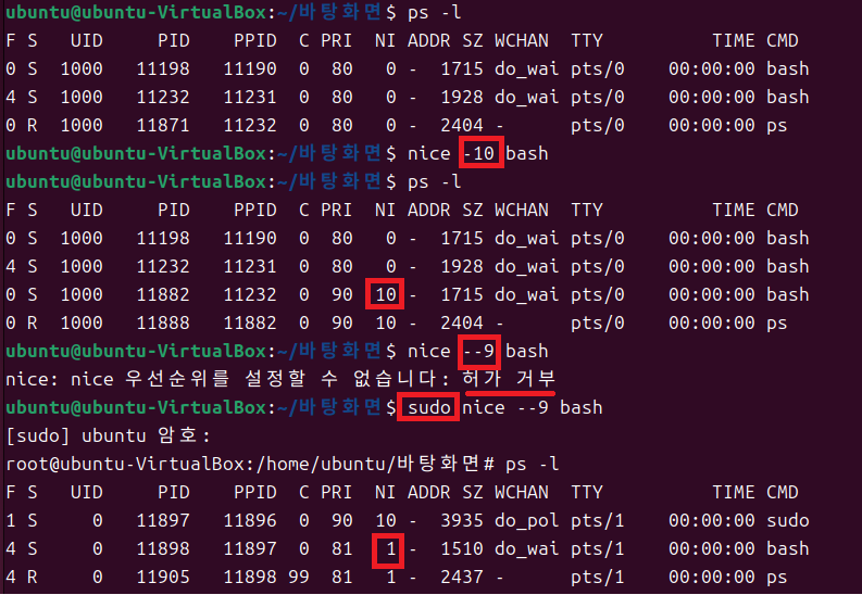 - nice 값 조정은 일반 사용자도 가능하지만, 우선 순위를 높히는 것은 root 계정만 가능