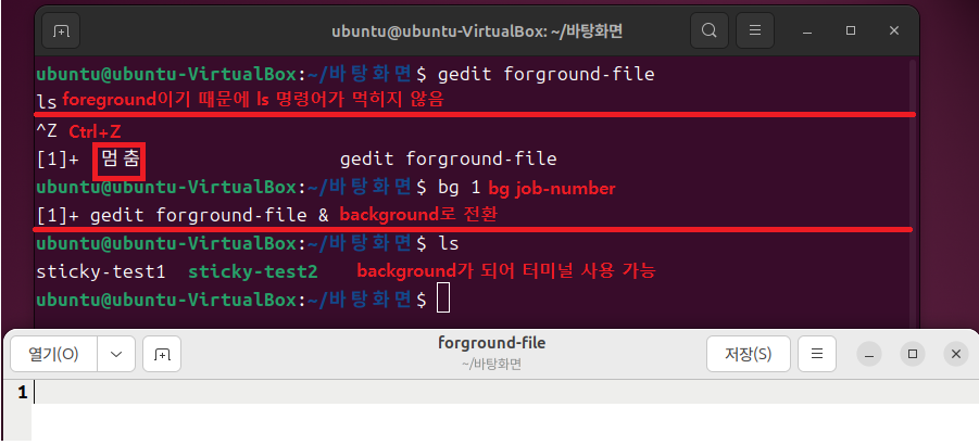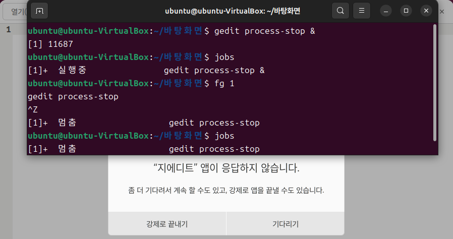 - 이전 포스팅에서 'gedit 파일명 &' 명령어에서도 &를 쓰지 않으면 백그라운드에서 실행되지 않아 터미널을 사용할 수 없었음