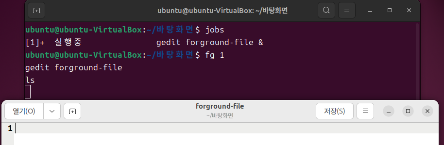 - jobs 명령을 사용해 프로세스 번호 알아내고, fg 명령어를 사용하여 프로세스를 포그라운드로 전환