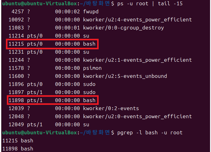 # root사용자가 실행한 bash 프로세스 정보를 확인