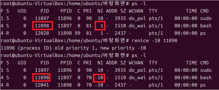 → 위의 사진에서 11882라는 프로세스가 생성되었고 부모 프로세스의 PID(PPID)를 11232로 가졌음 - renice는 PID로 우선순위를 조정하고 기존의 프로세스 우선순위 값을 추가 없이 바로 수정
